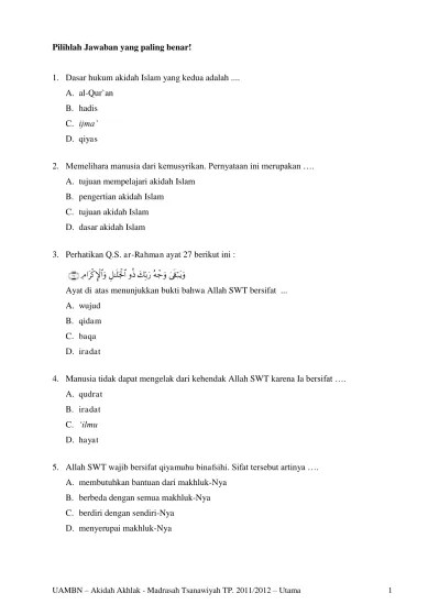 Latihan soal uambn akidah akhlak ma tahun 2019 2020 pendidikan kewarganegaraan. soal ini sudah disusun sebanyak 50 yang dibahas oada. Sebagaimana diketahui usbn dan uam di madrasah dikenal juga istilah uambn (ujian akhir madrasah berstandar nasional). Contoh soal pilihan ganda qada dan qadar beserta jawabannya. Kisi kisi uambn mi mts dan ma tahun 2016 kurikulum ujian akhir.
